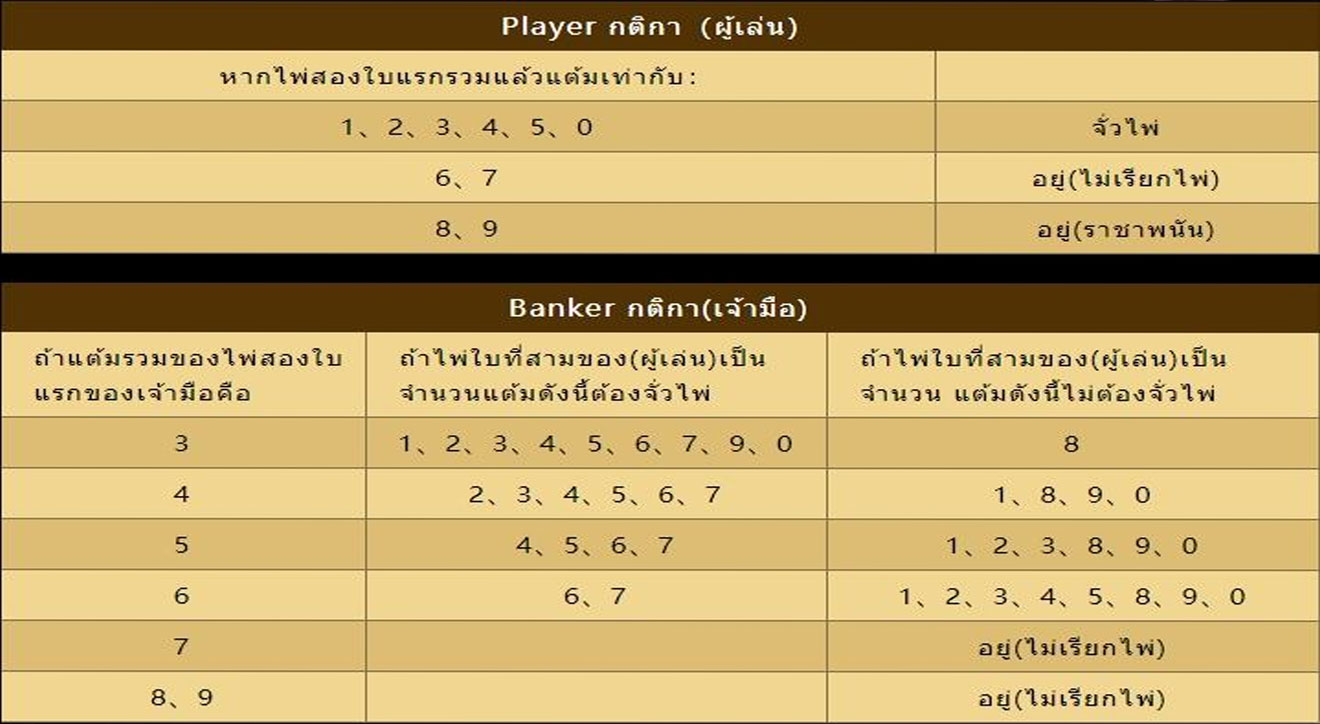 กติกาบาคาร่า สำหรับข้อนี้ไม่เคยเปลี่ยครับ เมื่อไพ่เปิดมา 2ใบแล้วกรณี banker มี 6แต้มแล้วในขณะที่ player มีแต้มต่ำกว่า 5แต้ม player ต้องเรีกไพ่เพิ่มอีกใบ ในกรณี่ใบที่ 3ฝั่ง player ที่เรียกมาเป็นเลข 6หรือ 7ไม่ว่า player จะมีแต่รวมแล้วเท่าไรก็ตาม banker จะต้องเรียกไพ่อีก 1ใบตามกติกาแล้วจึงมาดูผลแพ้ชนะกันเมื่อไพ่ครบ 3ใบทั้ง 2ฝั่ง ถ้าผู้เล่นไม่เข้าใจกติกาข้อนี้ถือว่าเป็นนักเล่นหน้าใหม่ และยังไม่เข้าใจกติกาบาคาร่าได้ดี 100% ทำให้โอกาสเล่นชนะลดลงไปด้วย ก่อนเล่นจึงสมควรจะอ่านกติกาให้เข้าใจก่อนจะไม่เสียหาย
