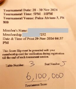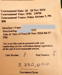 เราเล่นจนครบ 6 เกมส์ตามกติกาแทงขั้นต่ำที่ 50,000 ต่อเปิด ซึ่งเราแทงไม่ผิดเลยแต่แทงน้อย ชิปรวมได้สูงสุดแค่ 3,750,000 เท่านั้นเสียดาถ้ายกสีเปิดละ 1 ล้านคงจะได้มีเงินไม่ต่ำกว่าเกือบ 10 ล้านแน่ๆ แต่ตั้งใจว่าแค่นี้พอก่อนเลยได้ผลมาอย่างที่เห็นว่าในกระดานเราอยู่อันดับที่ 14 เท่านั้น